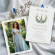 Experience the magic of Paris with Dream Quinceañera Invitations: Eiffel Tower, Floral Garland, Butterflies, and Photo. The iconic Eiffel Tower stands majestically in its signature color, a symbol of elegance and sophistication. A delicate floral garland, woven with blue flowers and green leaves in various shades, envelops the image in an aura of romance and sweetness. Vibrantly colored butterflies flutter around, adding a touch of joy and freedom to the composition.