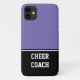 iPhone 11 Gehäuse wird in einem lila- & schwarzen Farbblock-Stil angezeigt. Cheer Coach Passen Sie diesen Artikel an und ändern Sie den Text oder kaufen Sie, wie es ist.
