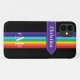 Dieses personalisierte Case-Mate Gehäuse für iPhone 11 weist in der Mitte ein in Regenbogenfarbenes vertikales Streifen-Muster auf, mit einem violetten lila Bannerband, das horizontal unter der Kamera verläuft und eine weiße Naht und eine weiße Schrift aufweist, die Sie mit Ihrem Namen oder anderen Texten anpassen können. Es gibt auch ein 3-Buchstaben-Monogramm, zentriert am unteren Rand. Der schwarze Hintergrund kann in jede gewollt Farbe geändert werden. Sie werden stolz darauf sein, dieses moderne und trendige neue Hotel zu präsentieren, das eine schicke Aussage macht! Wenn Sie Hilfe benötigen, senden Sie eine E-Mail an niteowlstudio@gmail.com.
