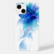 Dieses iPhone 14 Gehäuse wird in weißer Farbe mit einem blau-tropischen Blume gedruckt. Passen Sie dieses Objekt an oder kaufen Sie, wie es ist. Bild