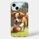 Ein Hund, der mit einem Ball im Gras spielt