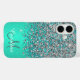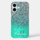Blau aquamarin und silber PRINTED Glitzer, personalisiert mit Ihrem Namen und Monogramm. Imitate aus grün gebürstetem Metallstahl. iPhone 16 Gehäuse für Handys.