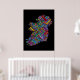 Eine Typografie-Textkarte Irlands mit über 590 Städten und Städten in Irland. Mehrfarbiger Text auf schwarzem Hintergrund.