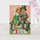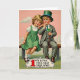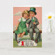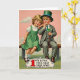 Designed with a vintage illustration style, the card shows two children seated close together on a wooden bench, their rosy cheeks and wide eyes giving them a gentle, affectionate look. A blonde girl in a green pinafore dress leans into a thoughtful boy, as if sharing a quiet secret between friends 💚. He wears a grey suit with a green tie and an emerald top hat trimmed with a slim blue band, adding a classic Irish touch. Behind them sits a soft rose-tinted sky with thin, wispy clouds, while a deep green foreground frames the scene with springlike color ☘️. The boy holds a shamrock at the end of a slender cane, angled slightly toward the girl as though offering it to her. Along the bottom, a decorative banner carries the line “1 WE LOVE THE OLD IRELAND,” with the large red “1” set before the rest of the words in darker lettering. The banner curves beneath the bench, edged with small ornamental flourishes and set against the earthy tones of the ground.