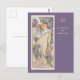 Eine Postkarte mit der Vintagen Illustration von Alphonse Mucha aus der Blume Series, Iris (1898), die digital restauriert und verbessert wurde. Ein Portrait einer Frau in einem Abend, umgeben von Lavendel-Iris-Blüten.