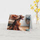 Ein fröhlicher irischer Setter-Hund sitzt vor einem Fan, sein Fell wird spielerisch von der Brise geblasen. Inside text kann geändert werden.