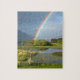 Ein echter irischer doppelter Regenbogen wird im Wasser von Lough Leane, Killarney, Irland, mit den nebelhaften Kerry-Bergen im Hintergrund reflektiert. Grüne Büsche, Schilfe und Eilen umgeben das Seeufer.