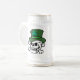 Totenkopf mit gekreuzter Knochen, der einen grünen Koboldhut trägt.