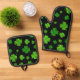 Schwarz-grün Ofen Mitt und Topfhalter Set mit irischem Thema. Hellgrüne vierblättrige Kleber decken beide Gegenstände ab, die zusammen oder separat erworben werden können. Ideal für alle glücklichen Köche, oder vielleicht für den Koch, der etwas Glück in der Küche braucht.
