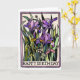 Ein Blumenstrauß mit wilden Reisen und anderen Frühlingsfarben, geschnitzt und bedruckt aus einem Linoleumblock und handfarben mit Aquarellen, ist ein guter Weg, um Happy Birthday zu sagen. Lila und grüne Farbtöne machen diese Auswahl frisch.