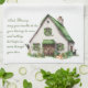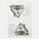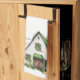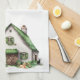 St. Patrick's Day Küchentuch mit einer Aquarellillustrierung eines klassischen irischen Bauernhauses mit grünen Schattierungen, einem Schweißnahtpaar in der Nähe der Scheunentür, Blume in Fensterkästen, zwei Schmetterlinge in den Schattierungen der irischen Flagge, ein Lamm, das rechts von der Scheune herauskommt, eine schwarz-weiße Kuh, die aus dem links Zuhause steht und ein goldenes immer wieder auszieht vorne. Zum links von dem Bild, ein irischer Segen - Mögen Ihre Probleme weniger sein, Ihre Segnungen mehr und nichts als Glück kommen durch Ihre Tür in einem grünen Schriftart.