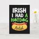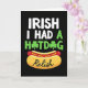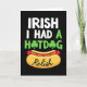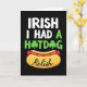 This card features a sharp black background that makes the design pop, with a stacked pun centered on the front for quick, easy reading. At the top, “IRISH I HAD A” appears in white sans‑serif letters, sitting above the main word like a teasing setup. “HOTDOG” is written below in bright green, and the two “O” letters are replaced by small shamrocks, adding a flirty St. Patrick’s Day wink ☘️. Under the text, a simple cartoon hotdog rests in a warm golden bun, like it’s being offered to someone with a grin. The sausage is red with thin yellow mustard lines, and the tidy shapes give it a friendly, date-night snack feel 💚. Across the bun, the word “Relish” is written in black cursive lettering, placed right on the bread for the double-meaning joke. The overall layout stays centered, with high-contrast white and green text above the hotdog illustration on the dark background.