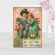 This greeting card shows two rosy-cheeked children sitting close together on a rustic wooden bench, their faces turned toward each other with a tender, trusting look 💚. The boy wears a grey suit with an emerald tie and a matching green top hat, and his bright eyes make him seem quietly pleased. Beside him on the bench rests a small shamrock, a simple touch that draws your eye and adds a sweet Irish note ☘️. The girl leans in at his shoulder, her golden curls spilling over a verdant green dress with a white lace collar, and her calm expression matches his. Her tiny red Mary Jane shoes stand out against the green ground like two little dots of color. An ornate, worn-looking border frames the scene, while the background is pastel pink with soft, cloud-like shapes floating behind them. Along the bottom, a decorated numeral “1” comes before the phrase “WE LOVE THEE OLD IRELAND” in dark lettering beneath the illustration.