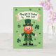 This greeting card features a friendly leprechaun centered on a pale green background, his rosy cheeks and bushy orange beard giving him a soft, welcoming look. He wears a tall dark green hat with a gold buckle, and his arms stretch outward as if he’s about to pull a friend into a quick hug 💚. Small shamrocks float around him in different sizes, adding a light, lucky feel without crowding the scene ☘️. Near the top, a cream banner curves across the card, drawing your eye upward like a ribbon in the breeze. The message “May you be touched by Irish luck” sits on the banner in flowing cursive-style lettering, set in a darker green that stands out against the cream. Simple shapes and strong outlines keep the leprechaun easy to read, with warm facial details that suggest easy friendship. The background stays pale green while the shamrocks and banner create a scattered, airy pattern around the central figure. End with a friendly line about sharing St. Patrick's Day sentiments.