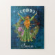 Die schöne Aquarellbilder zeigen die Mondgöttin in smaragdgrünem Gewand mit leuchtend rotem Haar auf Himmelshöhen. Anpassbar mit Skripttext in weiß