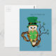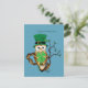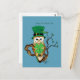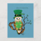 Niedliche Eule, die einen grünen Kobold mit zwei Kleeblatten trägt.
