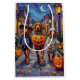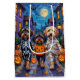 Adorable irische Red Setters, die in verspielten Halloween-Kostümen gekleidet sind, tragen Kürbiseimer, während sie unter dem mondbeleuchteten Himmel tricksen oder sich behandeln. Dieses festliche Design hebt den fließenden roten Mantel der Rasse, die elegante Bauweise und die lebendige Persönlichkeit hervor, die perfekt die sprichwörtliche und dennoch unterhaltsame Atmosphäre der Halloween-Nacht einfangen. Ein herzliches Fest für Hundefreunde und Halloween-Fans gleichermaßen.