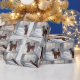 Ein irischer Setter-Hund mit einem gemütlichen Hut und Schal steht in einem schneebedeckten Wald, der in die Ferne blickt