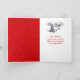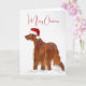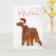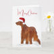 Irischer Setter im Schnee mit Hut und Schneeflocken des Weihnachtsmanns. Text kann geändert werden.