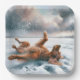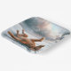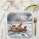 Ein fröhlicher irischer Setter rollt spielerisch im Schnee, sein Fell fängt das Licht an einem dramatischen Winterhimmel in einem Aquarelleffekt