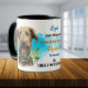 Ein Aquarellporträt eines glücklichen irischen Wolfhound-Hundes ist das Feature auf beiden Seiten dieser Tasse. Jedes Bild wird auf einem hellblauen Hintergrund des Spritzers platziert. Zwischen den beiden Bildern ist der Text, der diesen loyalen und schützenden Begleiter beschreibt, mit "the IRISH WOLFOUND" in schwarz am unteren Rand. Der gesamte Text ist leicht auf alles angepasst, was Sie bevorzugen, sodass Sie Ihren eigenen treuen Freund beschreiben können.