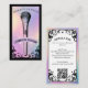 Veredeln Sie Ihre Schönheits- oder Make-up-Studio-Marke mit unserer iridierenden holografischen Vintage-Make-up-Studio-Visitenkarte mit einem handgezeichneten, verzierten Rollrahmen, der vor einem falschen iridierenden holografischen Hintergrund für einen auffallenden, tarot-inspirierten Look gesetzt ist. Die Vorderseite zeigt einen kosmetischen Rouge-Pinsel, der in das Rolldesign zentriert ist, und lässt Platz für den Namen und die Schlagzeile Ihres Studios, während die Rückseite elegante Schnörkel, einen iridierenden holografischen Rahmen und Ihre Kontaktdaten mit einem QR-Code für einfache Buchungen zeigt. Die dramatische Kombination aus Schwarz und schimmernden holografischen Akzenten schafft eine anspruchsvolle, mystische Ästhetik, die perfekt für Make-up-Studios, Make-up-Artists und Schönheitsprofis ist, die eine einzigartige, vintage-inspirierte Präs