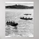 Vintage Irland Poster-Ansicht von Currachbooten auf See vor Inisheer Aran Island. Die Ruinen der Burg O'Briens verabredete aus dem 14. Jahrhundert und sind im Hintergrund auf der Insel zu sehen. Anfang der 1960er Jahre Irland Foto von Brendan Doyle.