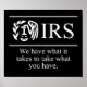 IRS :: Wir haben, was es braucht, um zu nehmen, was Sie haben. Sehr lustiges und echtes T - Shirt-Design mit einem modifizierten IRS-Logo und einem Smiley mit Dieb-Maske. Es ist ein klassisch gestaltetes Shirt mit sehr lustiger Bedeutung und wer will nicht, die IRS so viel wie möglich zu klopfen, nicht wahr?