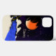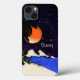 Palmen schwimmen am Strand der Insel mit orangefarbenem Mond in einer sternenreichen Nacht. Name hinzufügen oder Text löschen