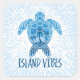 Eine stilisierte Meeresschildkröte in Blautönen mit Palmen-Silhouetten und fliegenden Seevögeln in ihrer Muschel. Der kühne Text unter der Schildkröte lautet "ISLAND VIBES" und ruft eine tropische und entspannte Urlaubsatmosphäre hervor. Tags: Meeresschildkröte, Palm, Sonne, Sonnenuntergang, Schildkröte, Meer, tropische, Reptilien, Sonnenaufgang, Strand, Urlaub, Kreuzfahrt, Insel, Insel, Paradies, Utopie, Glückseligkeit, Urlaub, Erholung, Ruhe, Ruhe, Insel Villen, Meeresleben, Meeresleben, Vogel, Möwe, Möwe, Stall, Baum, Ruhe, Palmen karibisch, im Ruhestand, Sommervibes