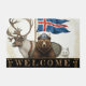 Island Welcome Doormat mit zeitgenössischer Kunst mit patriotischer isländischer Fahne, Rentier, Wikingbär und arktischem Fuchs im Jugendstil. Ursprünglicher Winter, lustige Hausmatte für jeden Anlass. Passen Sie den Text "Begrüßung" einfach an.