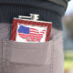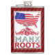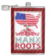 Insel Man Manx American Hip Flask. USA Map mit einer Mischung aus American und Isle of Man Flagge. Mit dem Text MANX ROOTS unter Baumwurzeln.