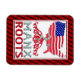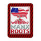 Isle of Man Manx American Flex Magnet. USA Map mit einer Mischung aus American und Isle of Man Flagge. Mit dem Text MANX ROOTS unter Baumwurzeln.
