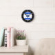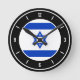 Israel Flag Elegant Round Clock mit der israelischen Fahne in der Mitte und schönen weißen Uhrennummern am Taktrand. Ein zauberhafter schwarzer Hintergrund mit weißen ovalen Elementen vervollständigt das Design und betont die Eleganz. Die wunderschöne Kombination aus Schwarz und Weiß mit der geschickten Integration der nationalen Flaggenfarben machen diese Uhr zum perfekten Geschenk und zum großartigen Stück an der Wand. © 2022 CountriesOfTheWorld