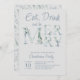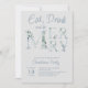 Iss Drink und sei frohe Weihnachten Party Einladung mit verzierter Aquarell Typografie. Iss Drink and be Merry ist in lässiger handgeschriebener Typografie geschrieben und die dekorative Schrift hat Wintergrün und Schnee in Blau und Grün.