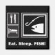 Auffallende Schwarz-, Weiß- und Graufarbene Zeichenbrettgrafiken, die die Lebensbedürfnisse darstellen. Kleine Ikonen zum Essen und Schlafen mit dem Standard-Messer und der Gabel, und Motel-Unterkunft Dach und Bettaufnahmen. Extra große FISHING Grafik mit einem Fischkopf und Angelhaken, denn natürlich ist Angeln wichtiger als Essen und Schlafen!
