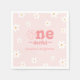 Niedliche 1. Geburtstagszeitung Serviette mit einem rosa, fett gedruckten Typografietext "onederful" in der Mitte und umgeben von Retro-Groovy Blume.