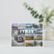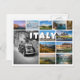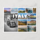 Souvenir Foto Collage Postcard von Italien mit den verschiedenen schönen Landschaften mit den Dolomiten Bergen, Städte, Toskana, Strände von Sardinien und Sizilien, Cinque Terre und Apulien mit dem Text "Italien" in Weiß.
