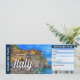 Überraschen Sie jemanden Besonderes mit dieser Italien-Reise-Enthüllung Bordkarte. Dieses reise Themenbezogene Geschenkticket ist eine schöne und unvergessliche Möglichkeit, einen Urlaub, eine Jubiläumsreise, einen Geburtstagsausflug oder eine Weihnachtsüberraschung anzukündigen. Es enthält einen atemberaubenden Italien-Hintergrund und anpassbare Reisedetails. Perfekt für die Schaffung eines unvergesslichen Reiseenthüllungsmoments.