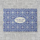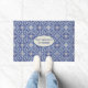 Fangen Sie mediterranen Flair mit diesem blau-weißen Fliesendesign an, das von Keramik gefliesten Fußböden Vintager europäischer Zuhause und Patios inspiriert wird. Ihr eigener Familienname, Hausnummer oder Willkommensnachricht erscheint im zentralen Textbereich.