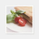 Papierserviette mit gesundem italienischem Essen, bestehend aus einem Caprese Panini Sandwich und Tomate, grüne Basilikum-Blätter und Mozzarella-Käse.