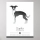 Desteis originelle Cartoon-Illustration einer Schwarz-Weiß-Fell-Farbe Italienischer Grauhund Rasse Hund. Es gibt drei personalisierbare Textbereiche, in denen einer für den Namen des Tieres, einer für die Rasse und ein anderer für einige Persönlichkeitsmerkmale sein könnte. Der Text wird durch einen stilistischen Rahmen mit Hundepflaster in der Mitte getrennt. Unten ist eine Farblinie, die der Farbe des Hundes entspricht.