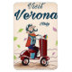 Verona Italien Urlaubsposter. Cartoon Mann auf einem kleinen italienischen Roller.