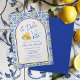 Feiern Sie die Braut mit einer angesagten Braudusche "La Dolce Vita" mit einem schicken Bogen-Rahmen und italienischen Kachelmustern in Blau, Weiß und Gelb mit Zitruslemon-Gelatine-Illustrationen, die an einen süßen und romantischen Sommer im Mittelmeer erinnern. Bitte schreiben Sie mir, wenn Sie Hilfe bei der Anpassung benötigen.