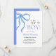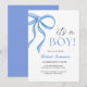 Elegant and Modern Baby Boy Shower Invitation in Blue and Gray, adorned with a Stylish Blue Ribbon and personalized Typography. Perfect for a Trendy and Memorable Celebration!