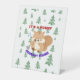 A cute and festive digital illustration featuring a chubby cartoon squirrel singing joyfully into a microphone. The squirrel is surrounded by blue musical notes, holding the mic with excitement. The text above and below reads "IT'S A FUNNY SQUEAKY SOUND" in bold red and purple font. The background consists of a repeating pattern of green sketched Christmas trees on a light grey backdrop, creating a humorous and holiday-themed design perfect for winter celebrations.