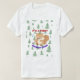 A cute and festive digital illustration featuring a chubby cartoon squirrel singing joyfully into a microphone. The squirrel is surrounded by blue musical notes, holding the mic with excitement. The text above and below reads "IT'S A FUNNY SQUEAKY SOUND" in bold red and purple font. The background consists of a repeating pattern of green sketched Christmas trees on a light grey backdrop, creating a humorous and holiday-themed design perfect for winter celebrations.