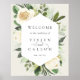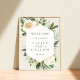 Unsere Hochzeitskollektion Ivory Bloom Aquarell mit zartem Aquarell, Eukalyptus-Blätter, grünem botanischem Blattwerk und Blume mit weißer und elfenbeiniger Tortur. Dieses elegante Begrüßungszeichen mit Namen und Hochzeitsdatum, eingebettet in einen lang gezogenen sechseckigen Rahmen, wird Ihnen persönlich gefallen.