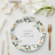 Unsere Hochzeitskollektion Ivory Bloom Aquarell mit Blütenfarben, einem Kranz mit zarten Aquarellpflanzen, Eukalyptusblättern, grünem botanischem Blattwerk und Blume mit weißer und elfenbeinfarbener Tortur. Personalisieren Sie diese Teller mit Ihren Namen, verbunden mit einem dekorativen Skriptakzent. Ideal zum Versiegeln von Einladungen oder Gunst-Taschen/Schachteln.