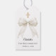 Complete your First Holy Communion celebration with these elegant round favor tags featuring a luxurious ivory bow with delicate pearl details and a subtle gold cross.